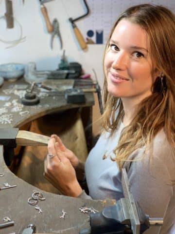 Her collections are often inspired by recurring natural themes which are symbols of strength, growth, and connection. Each piece is handcrafted in her Lewes studio using recycled precious metals and responsibly sourced materials, made with care for both craft and the environment. She often holds open studio days and also welcomes visitors by appointment, offering a chance to see where the jewellery is made and meet Phoebe and her dog, Pippi.