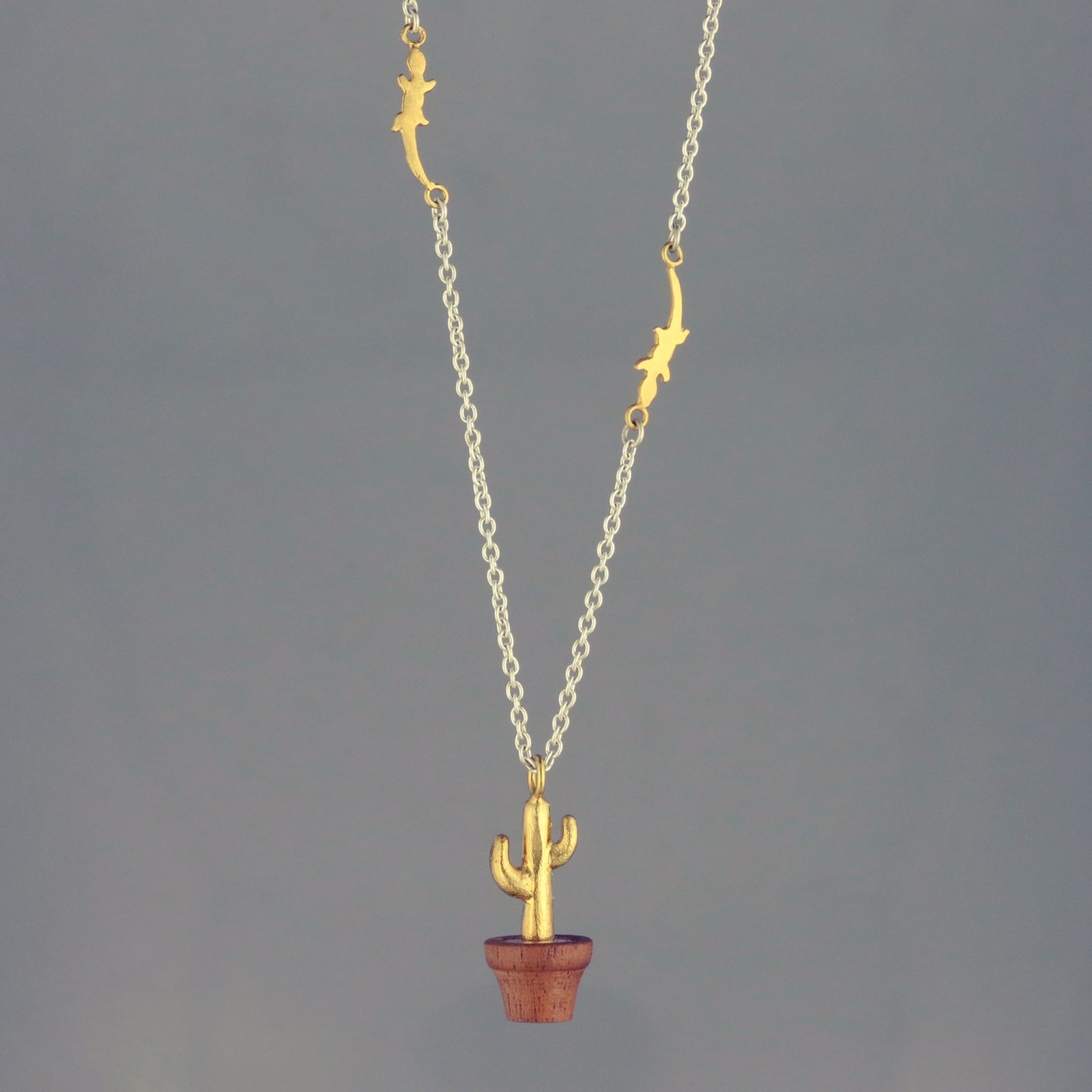 Potted cactus and gecko necklace in reclaimed mahogany, silver and/or gold vermeil with a hallmarked gecko shaped clasp.