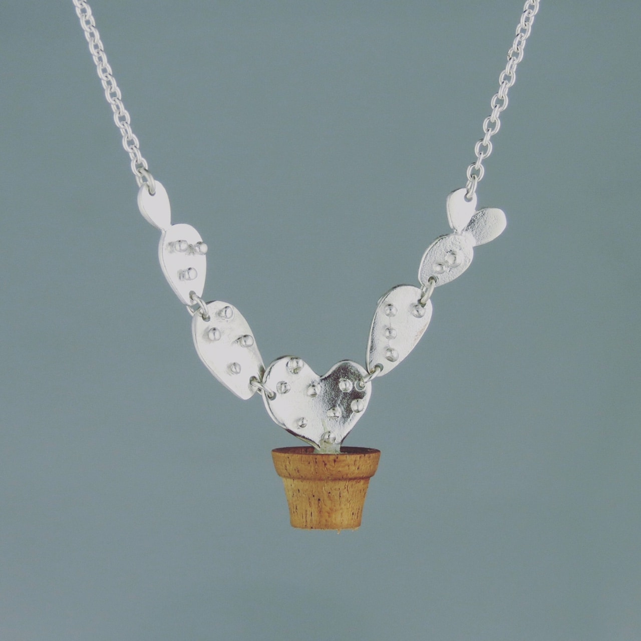 Prickly pear in pot necklace in reclaimed mahogany and sterling silver or gold vermeil with a hallmarked gecko shaped clasp.