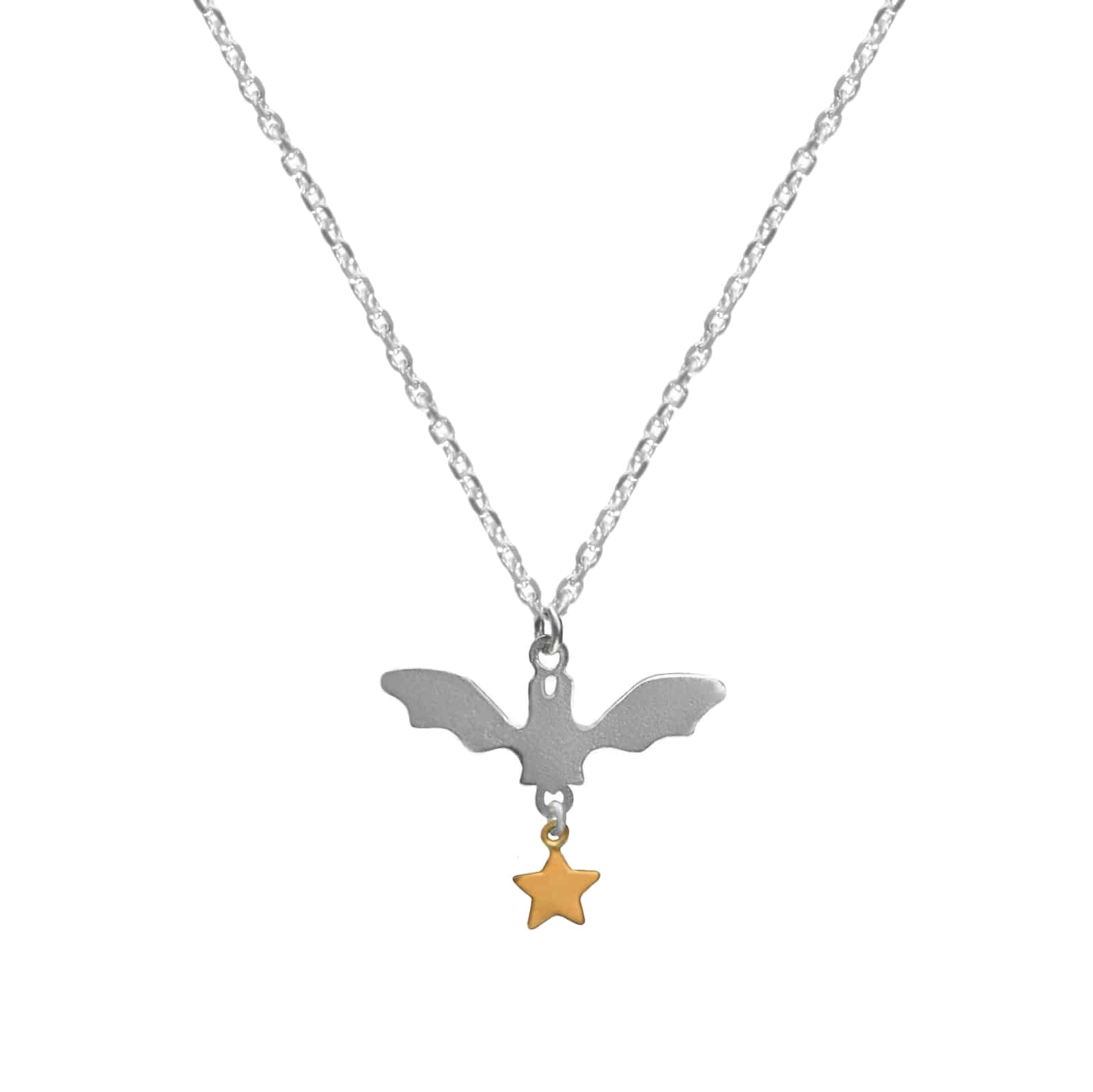 Silver bat pendant with gold vermeil star on a diamond cut chain with a star catch