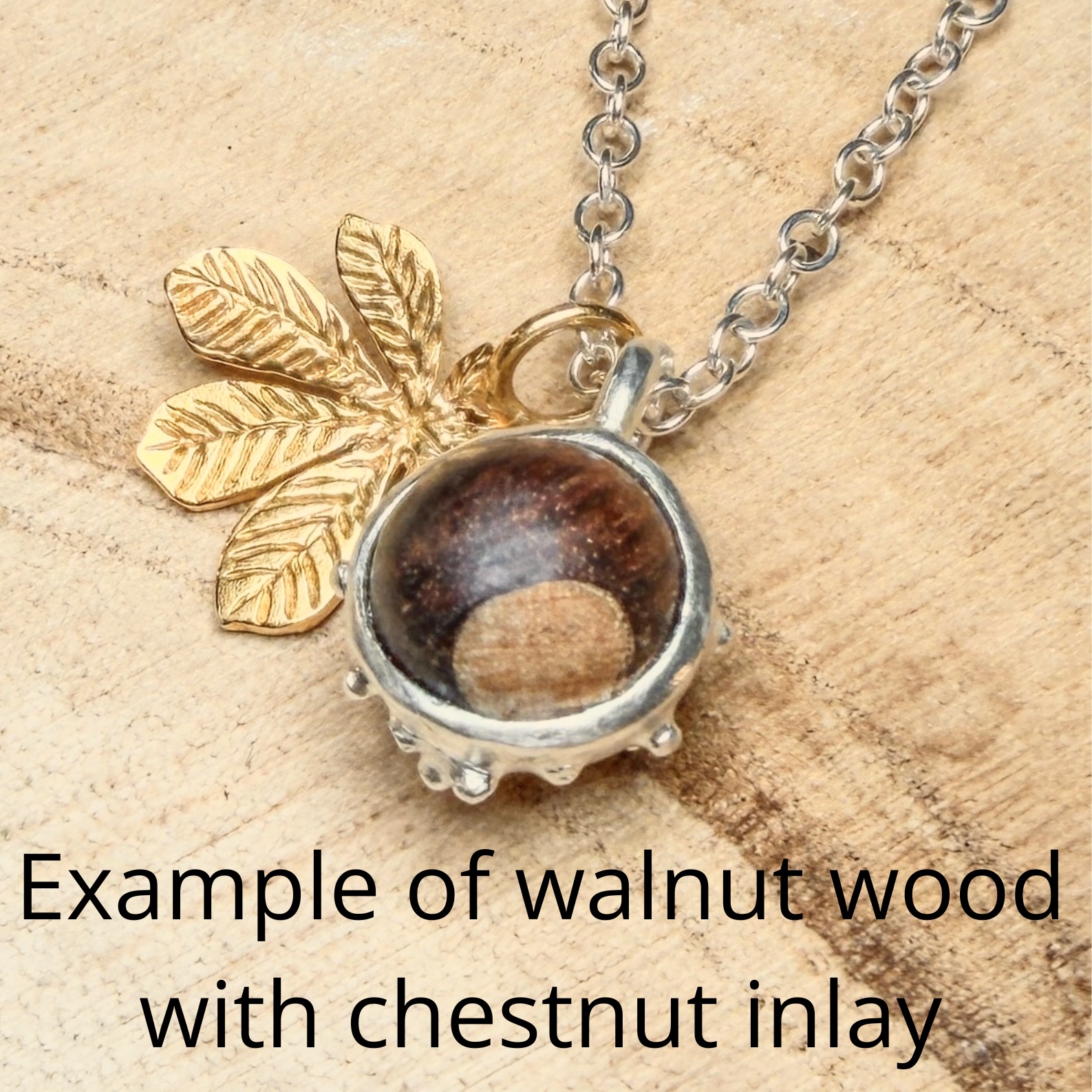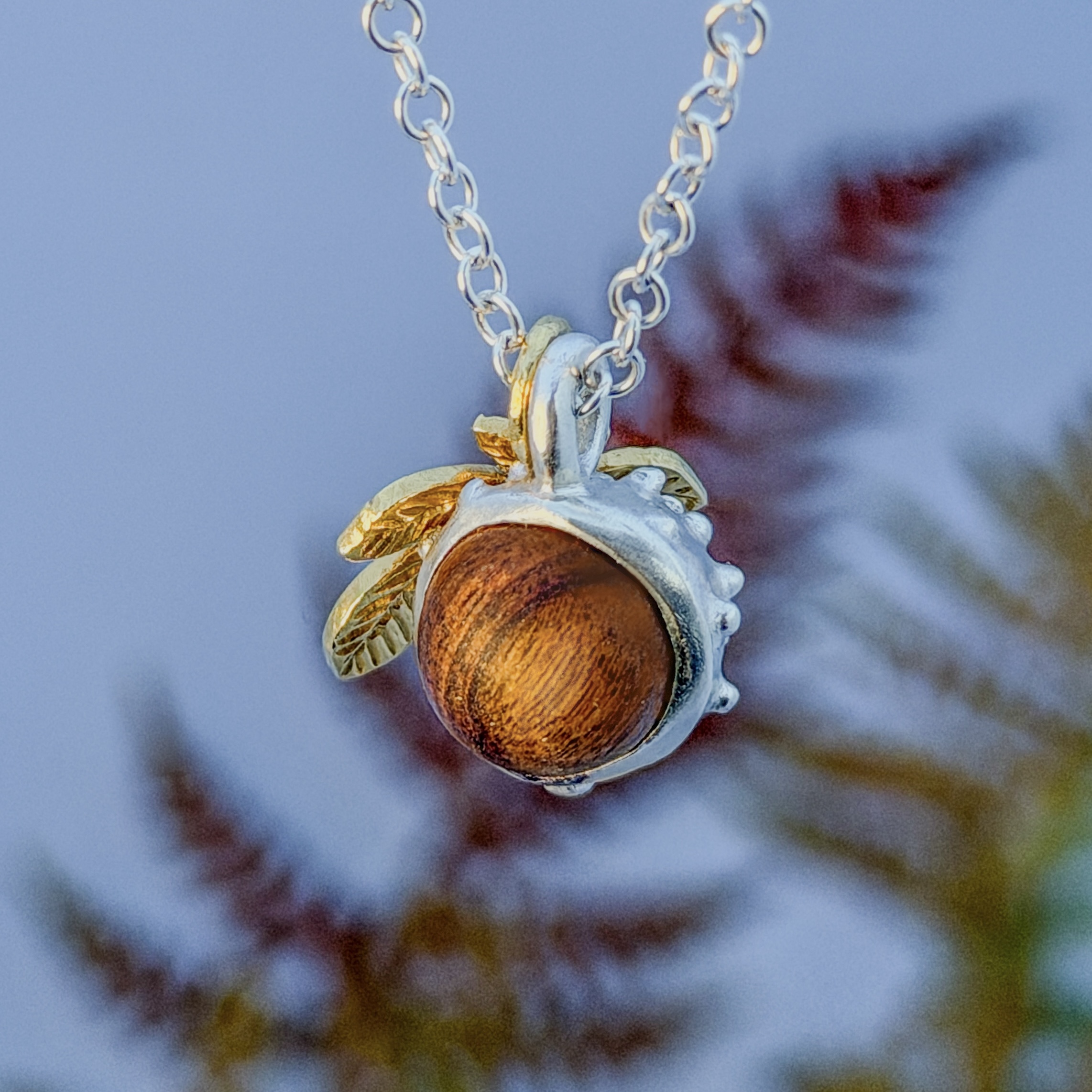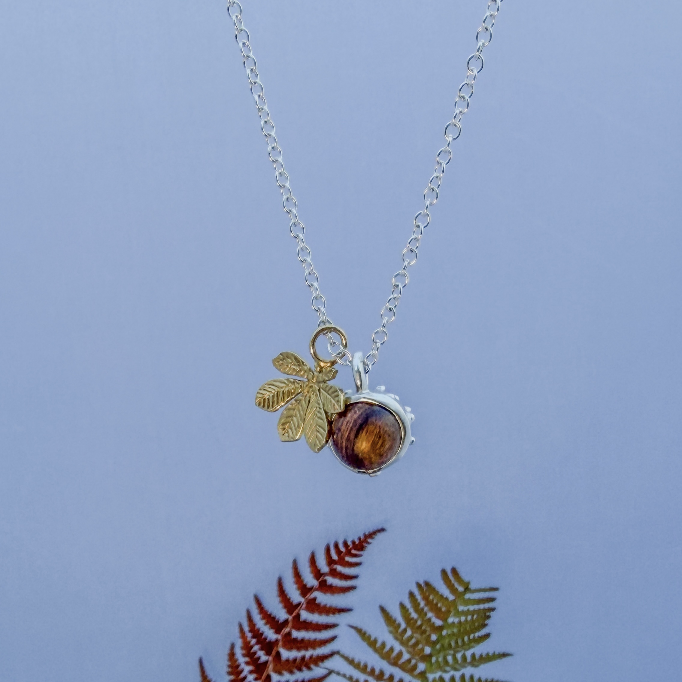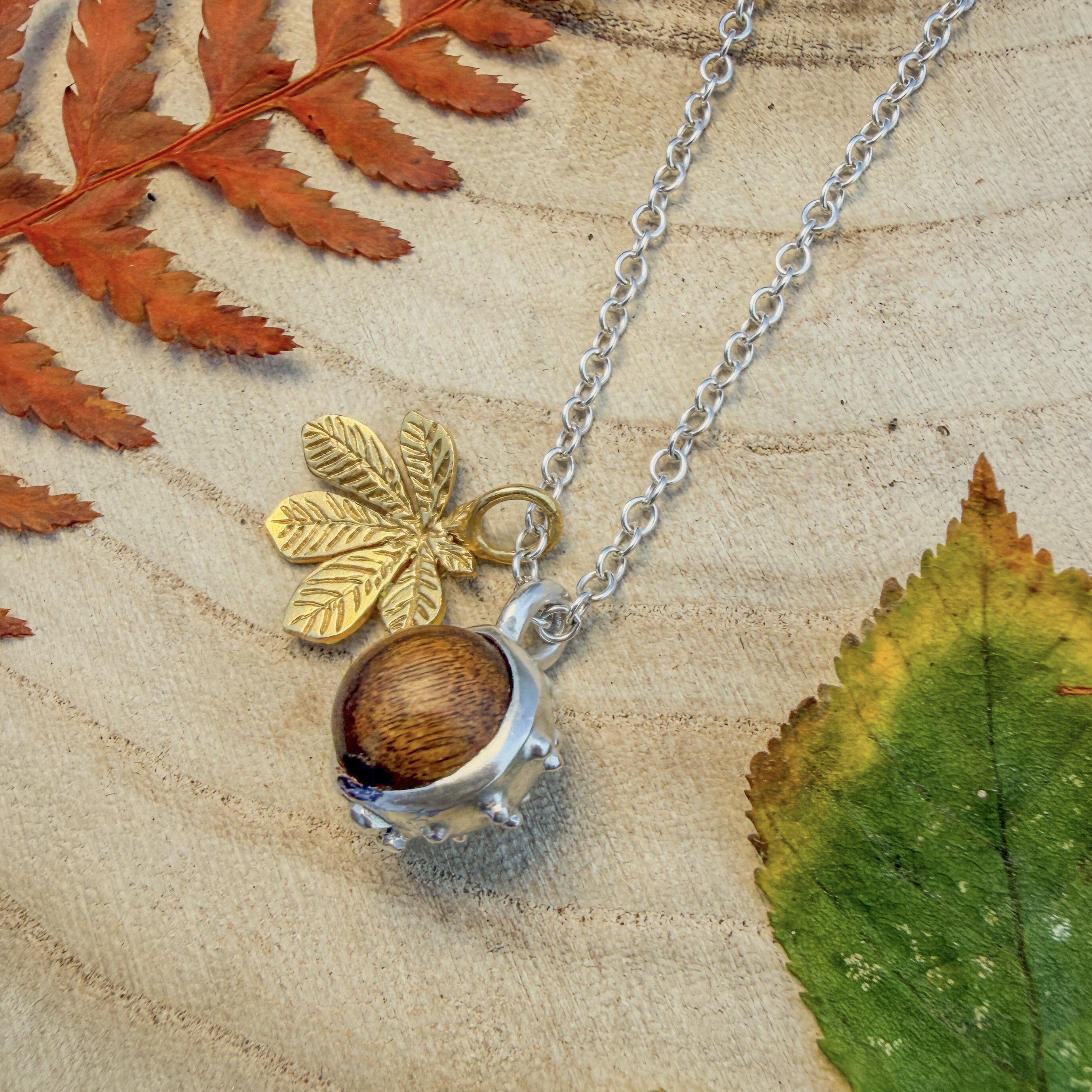 | Material | Wood, Silver and Gold Vermeil Conker and Chestnut Leaf Pendant |