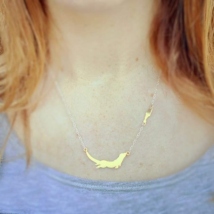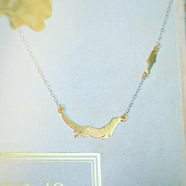 A silver and gold vermeil otter & fish necklace which fastens with a fish shaped clasp
