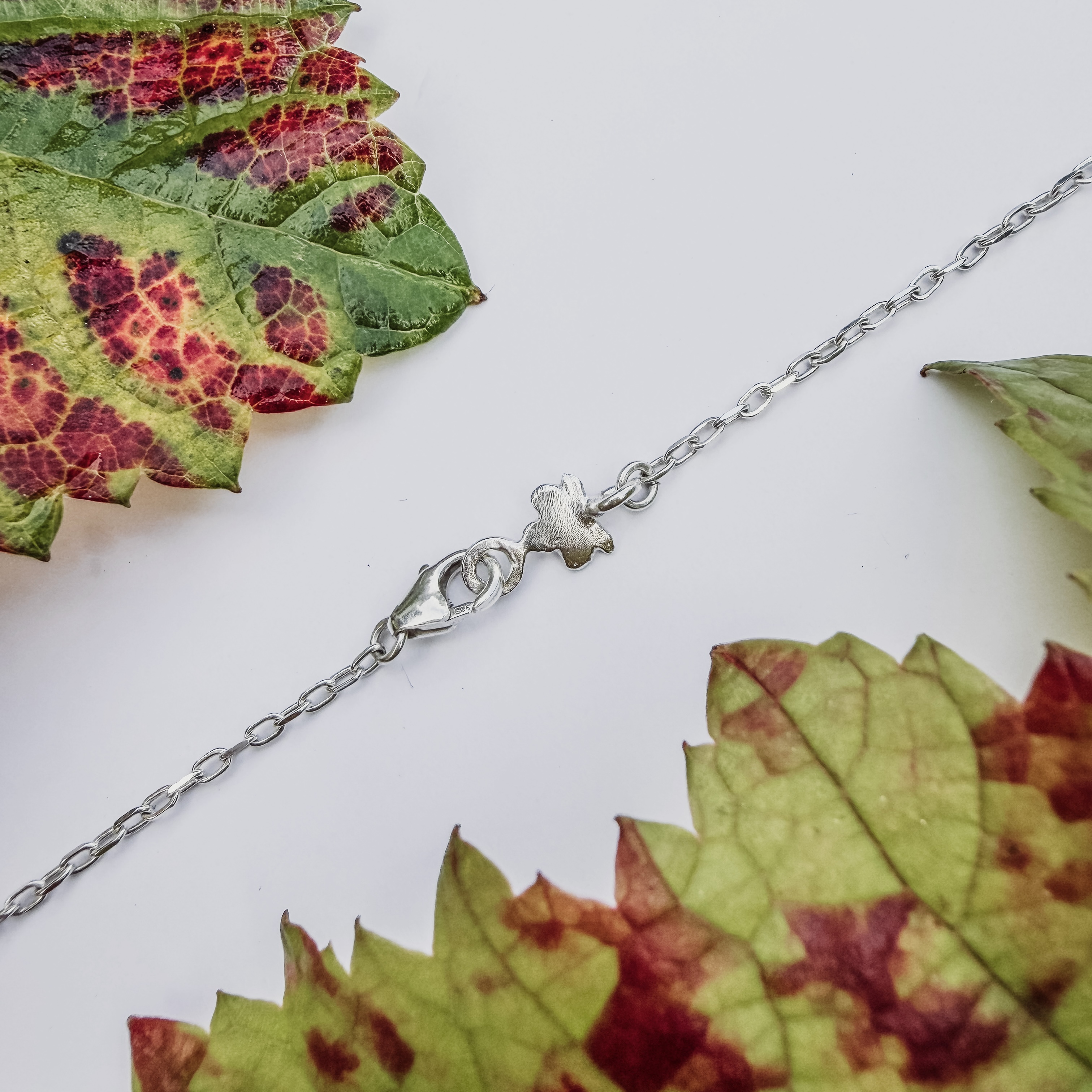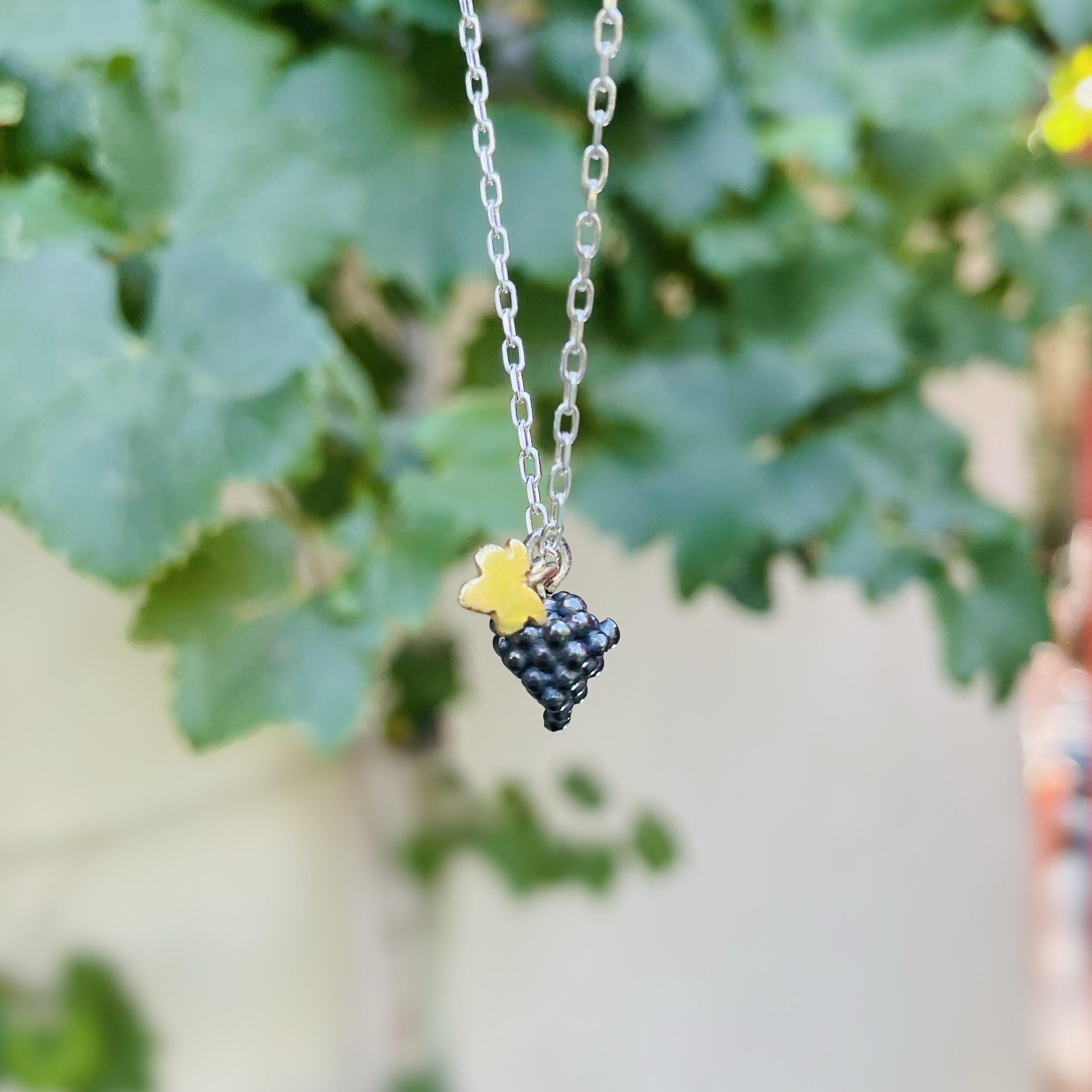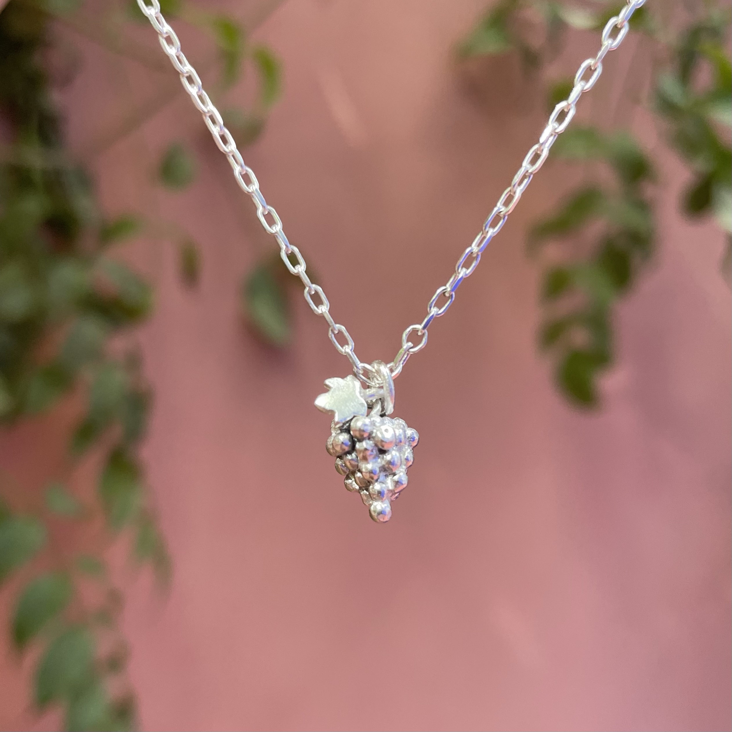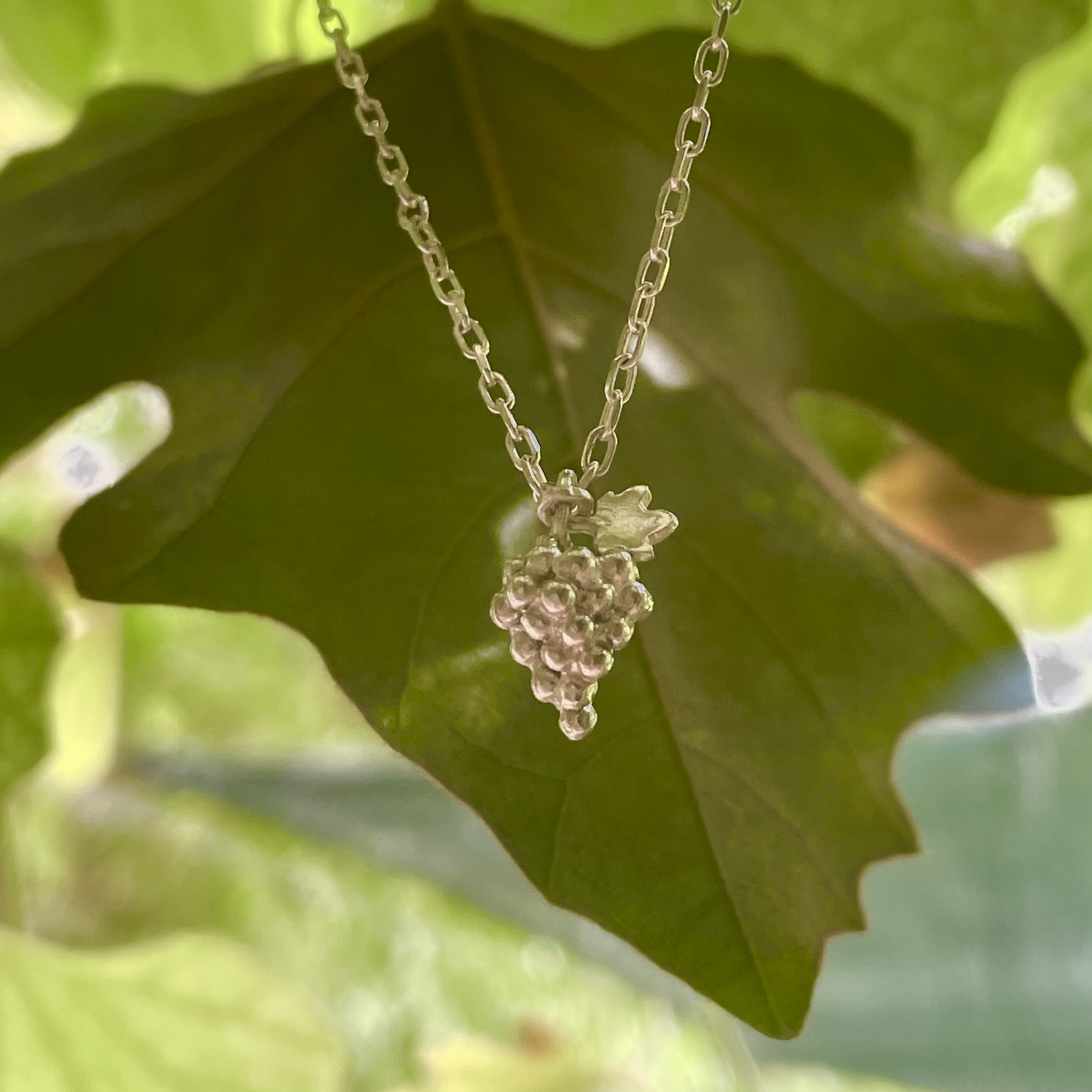 A cluster of grapes with a little vine leaf that which you can choose in a contrasting finish. The chain on this pendant fastens with a vine leaf shaped clasp. Handmade in recycled sterling silver. Select your desired length and finish. This can also be crafted in solid gold, just enquire for a quote.