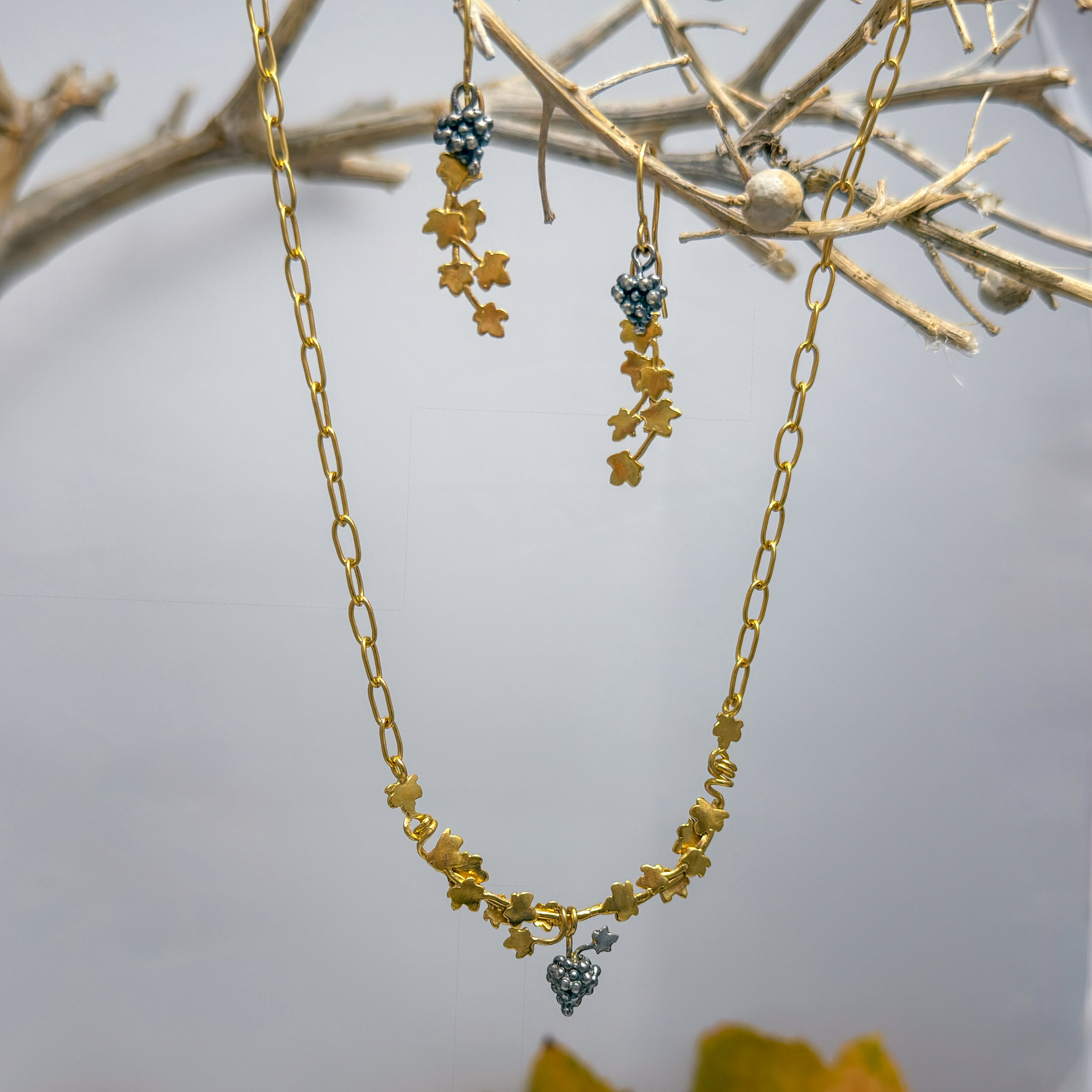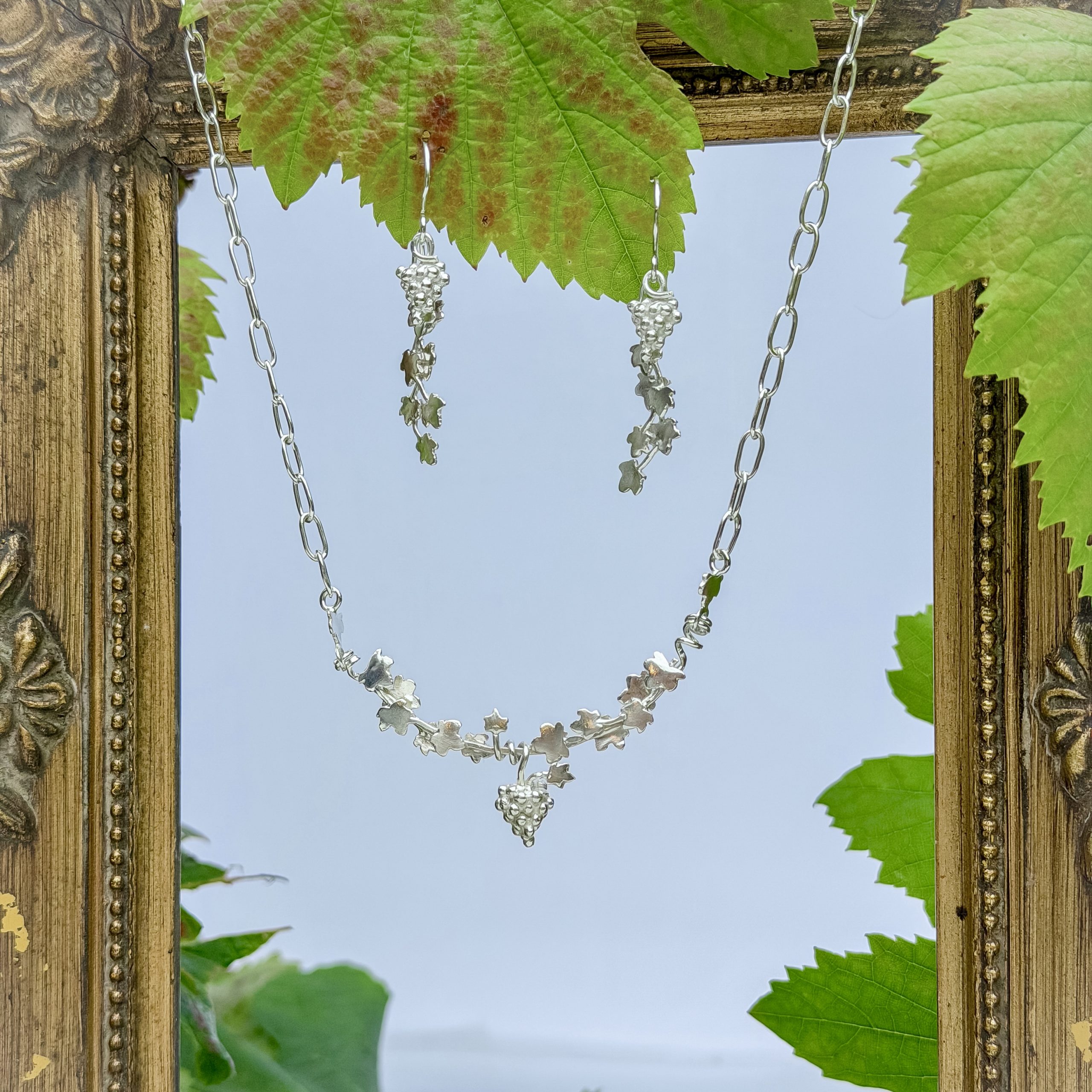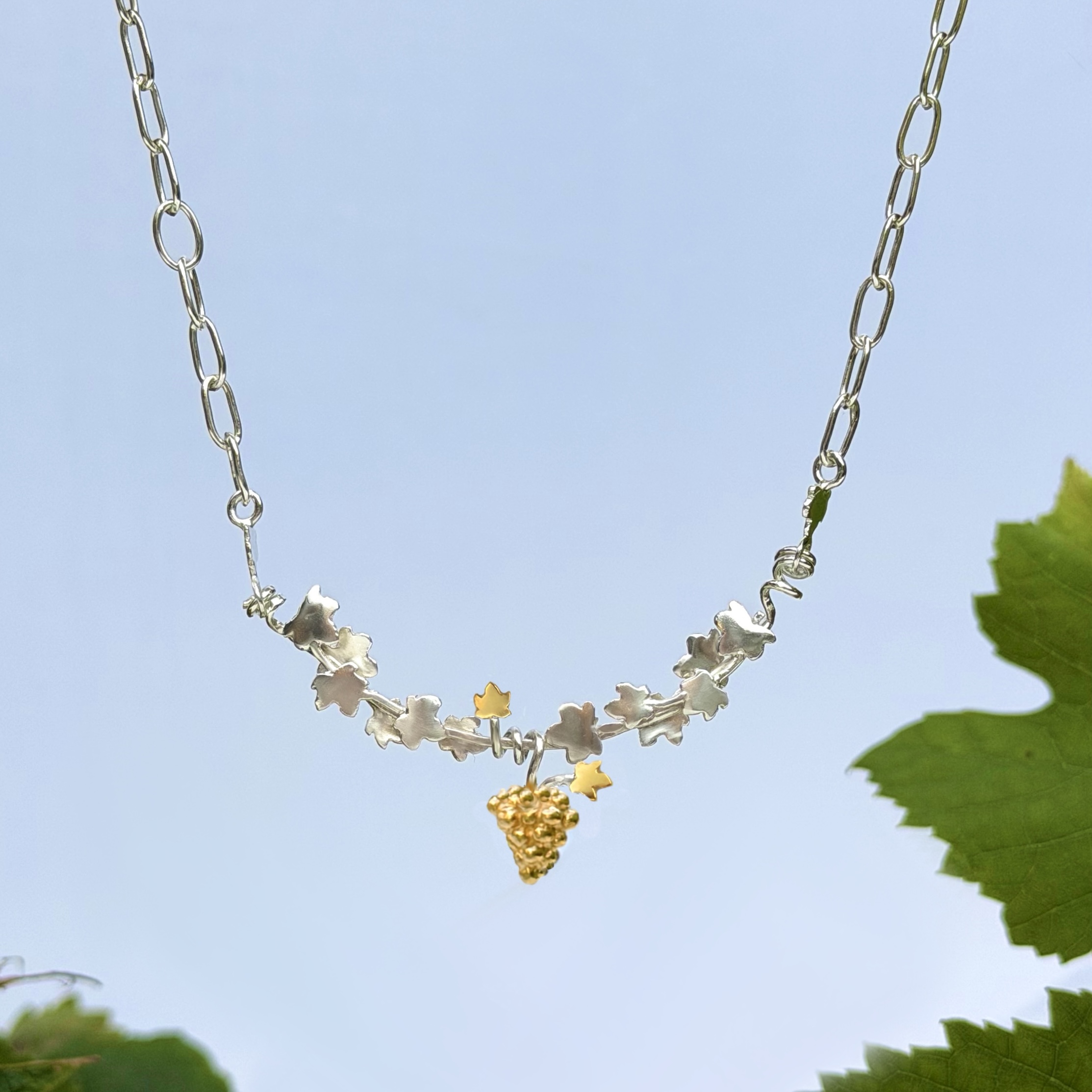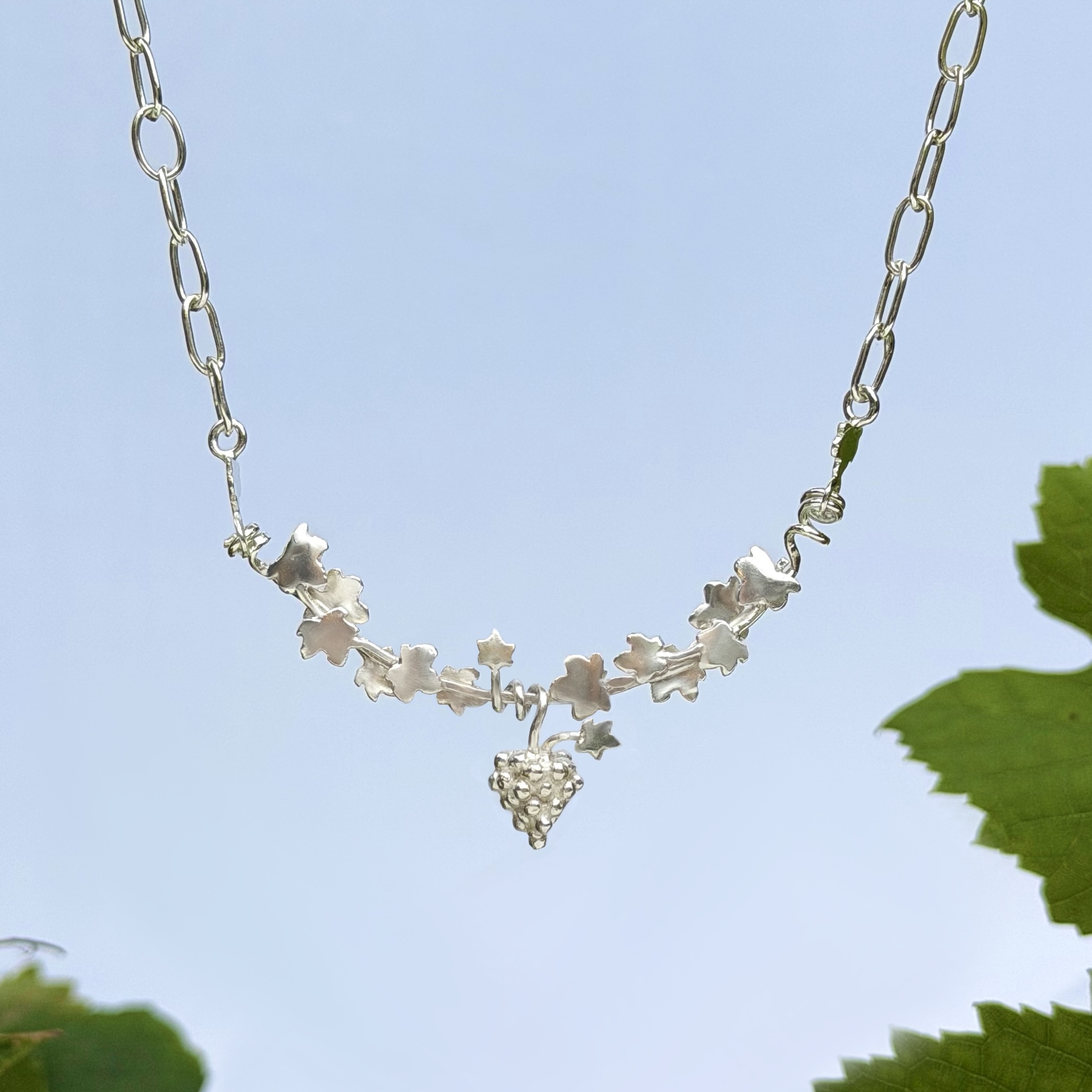 A necklace of twisting vines with a cluster grapes, handmade in recycled sterling silver. Select your desired length and finish. This can also be crafted in solid gold, just enquire for a quote.