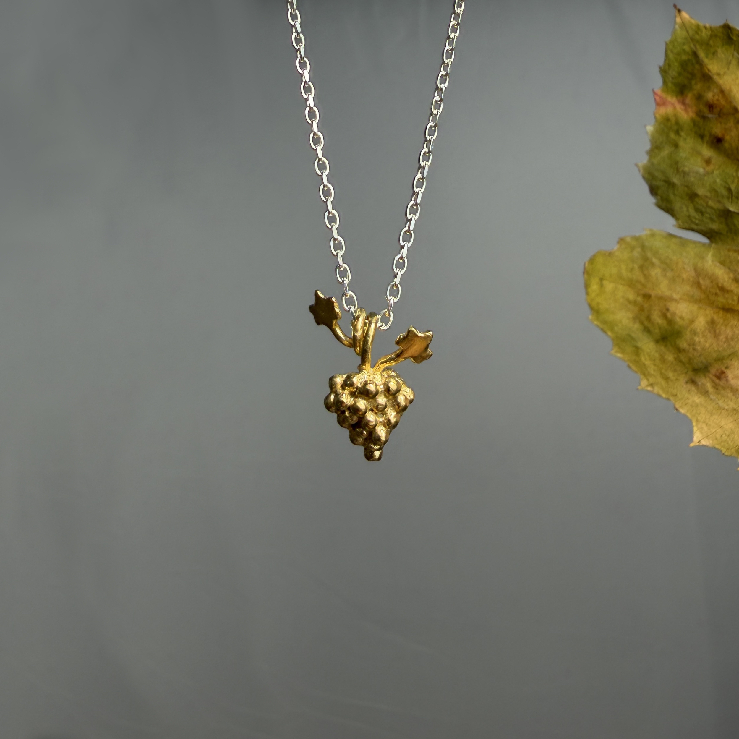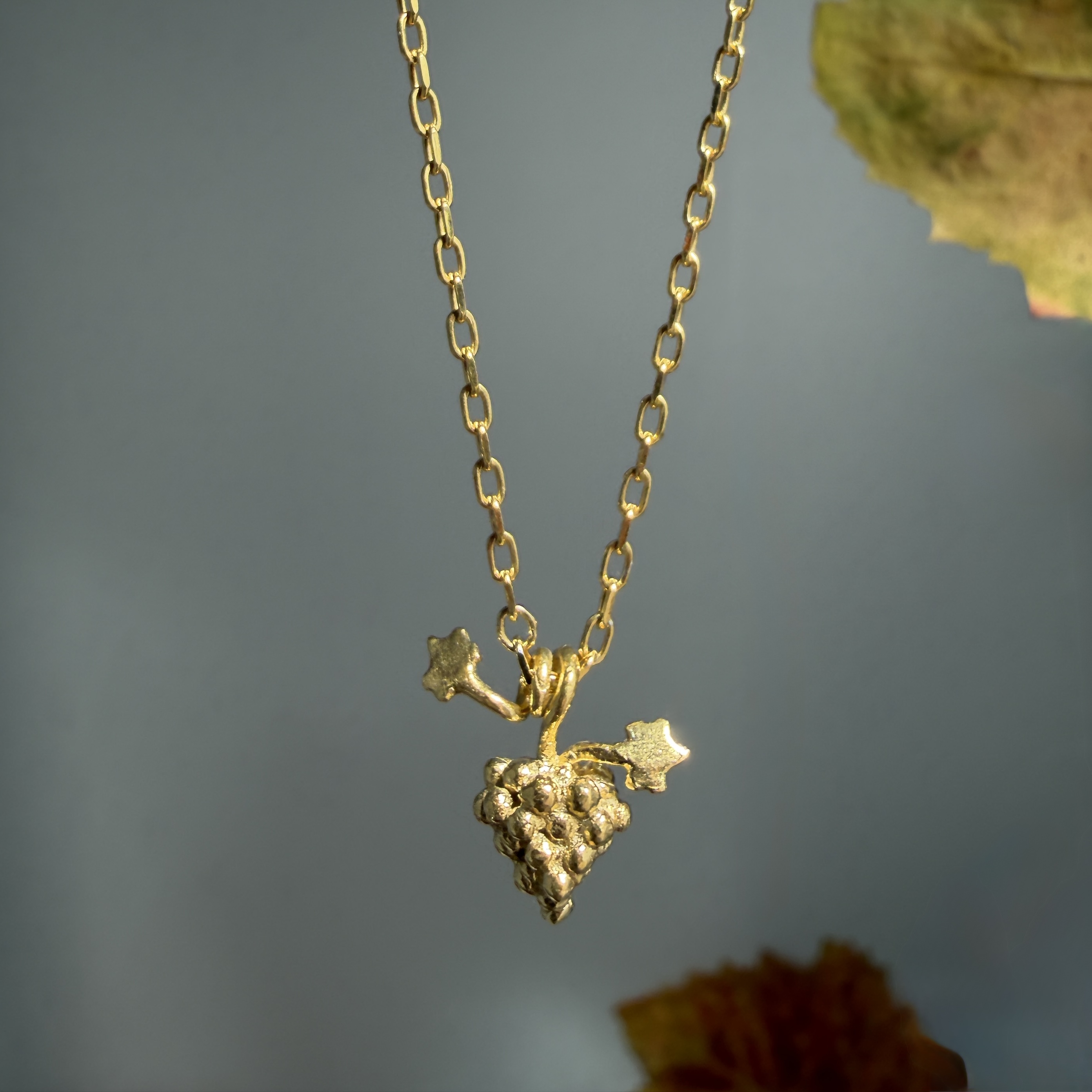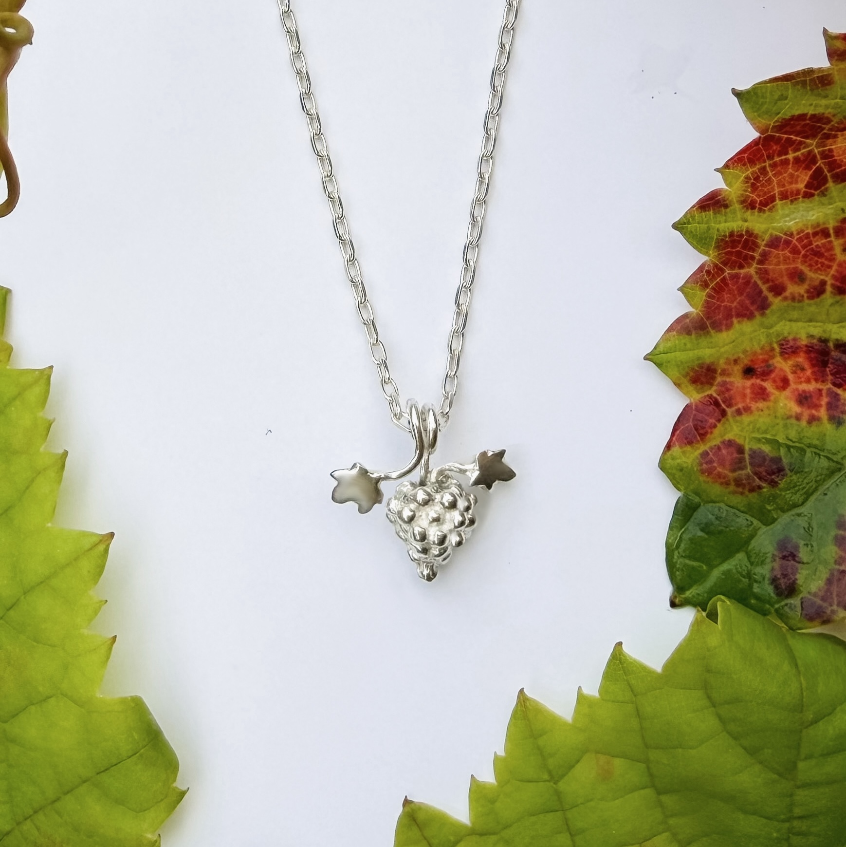 A cluster of grapes with spiralling vine leaves, the chain on this pendant fastens with a vine leaf shaped clasp. handmade in recycled sterling silver. Select your desired length and finish. This can also be crafted in solid gold, just enquire for a quote.