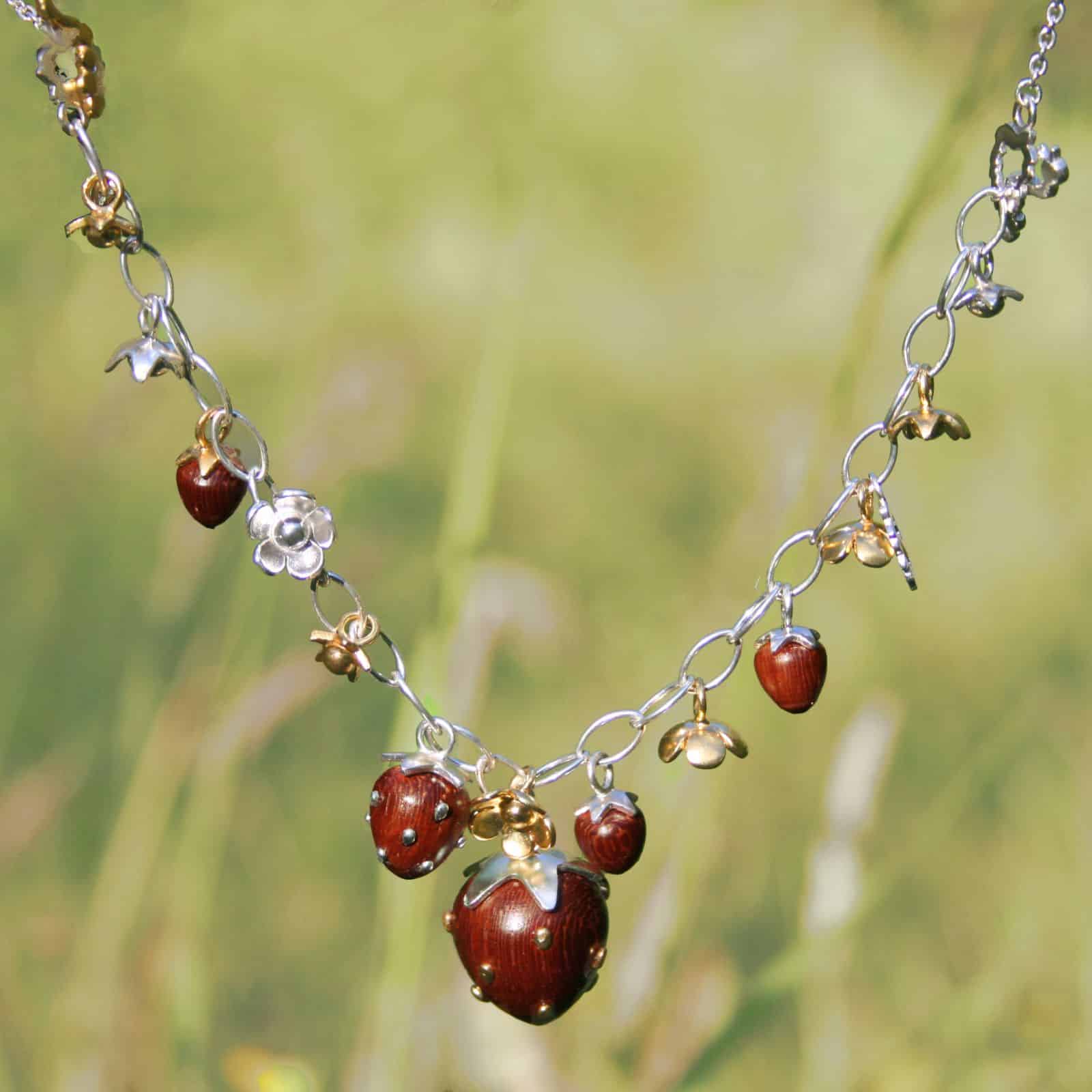 The front of this necklace is made from a large linked chain with five Yew wood strawberries in varying sizes alongside silver and gold vermeil stalks, flowers, leaves and caterpillars. This part of the necklace can be detached from the rest of the chain to also be worn as a bracelet!