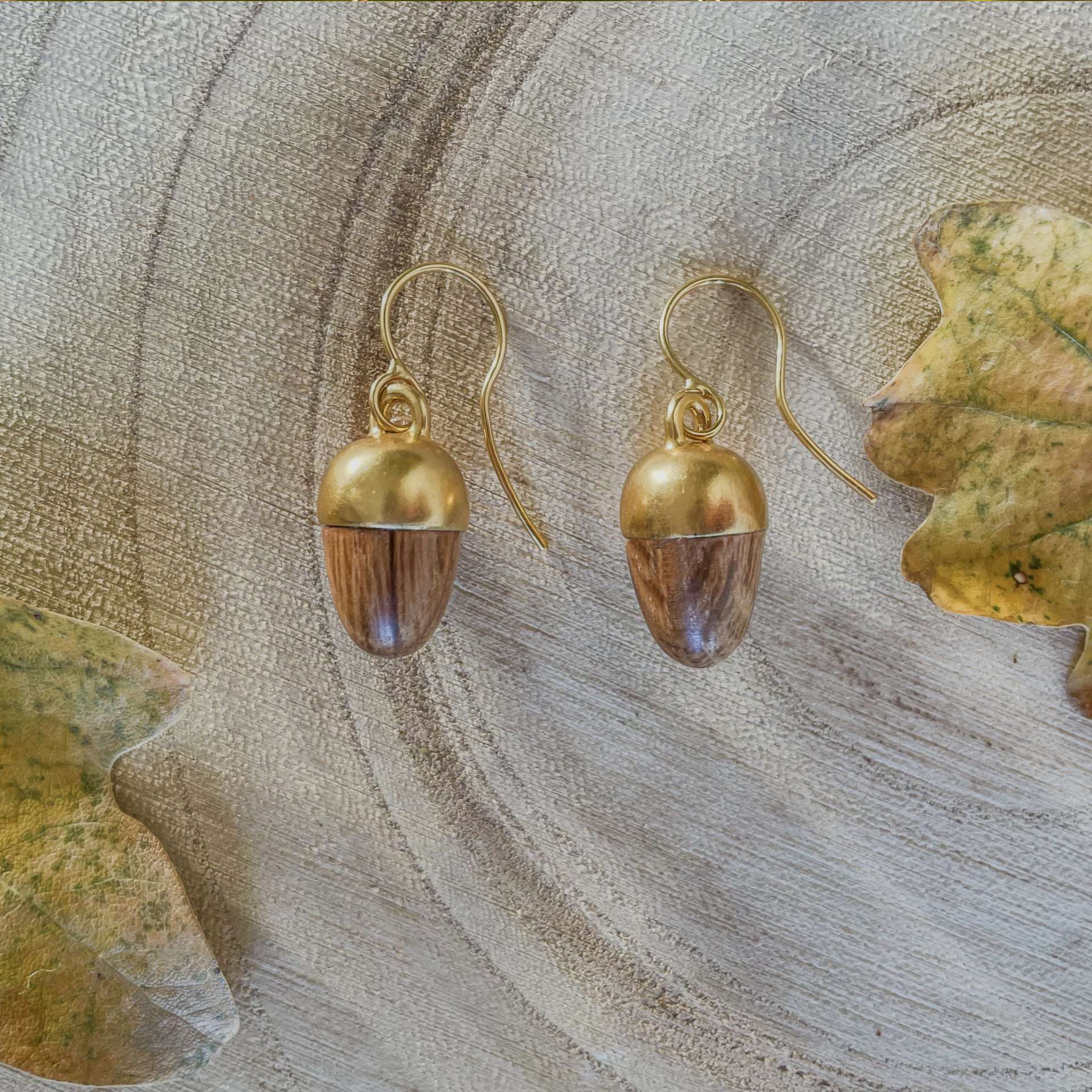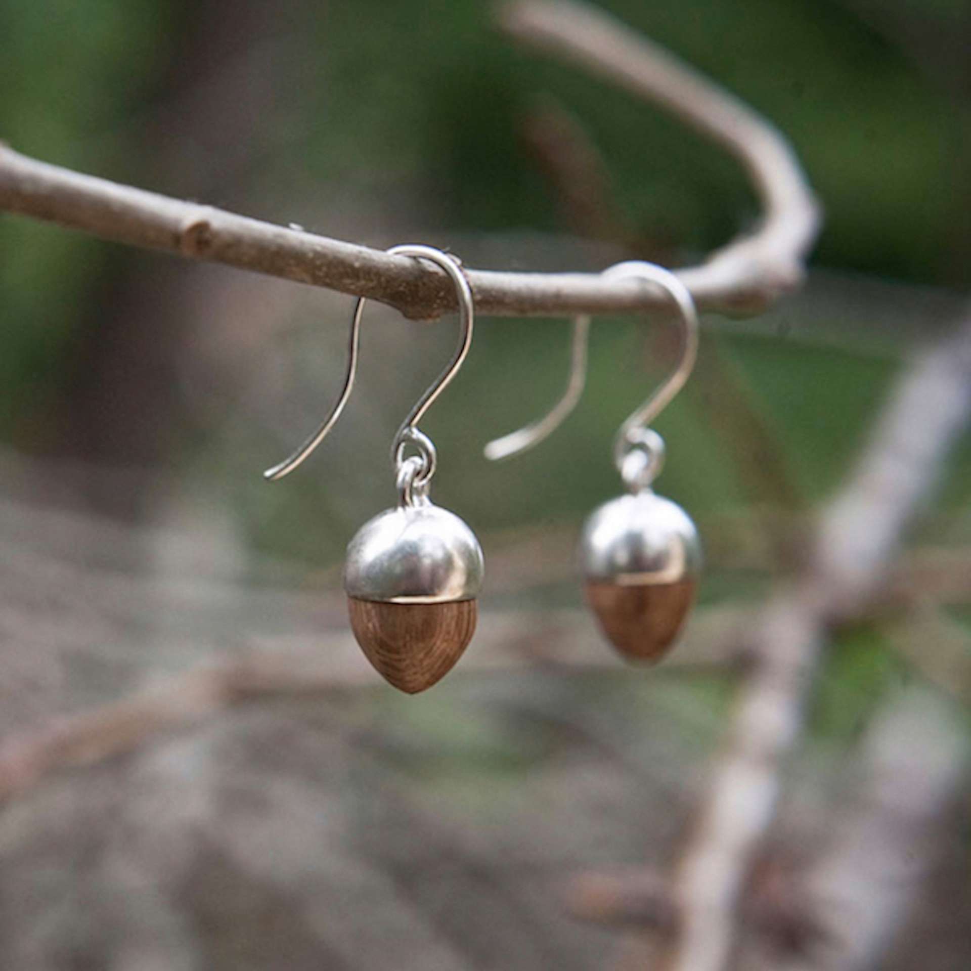 Silver and oak acorn drop earrings