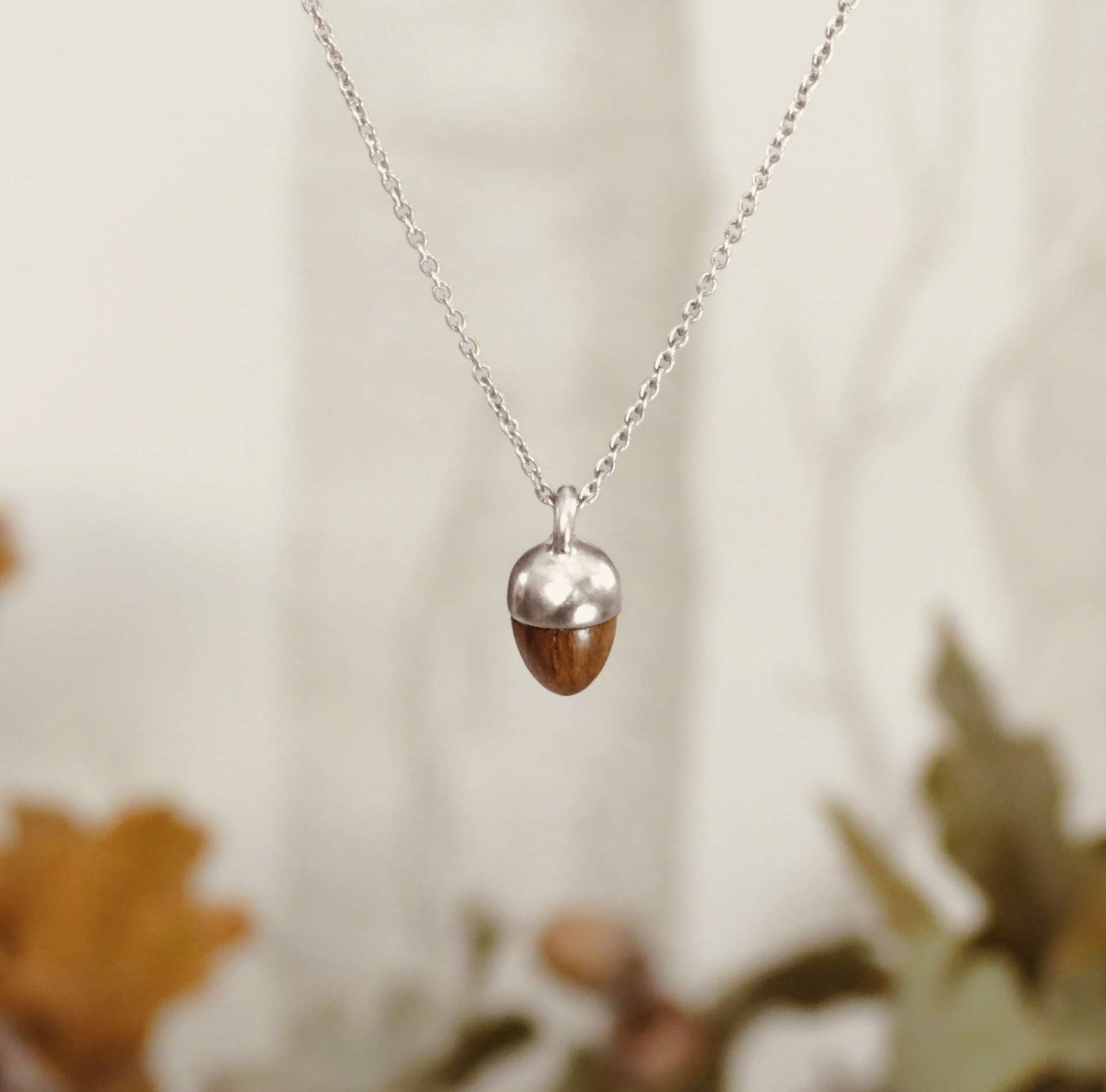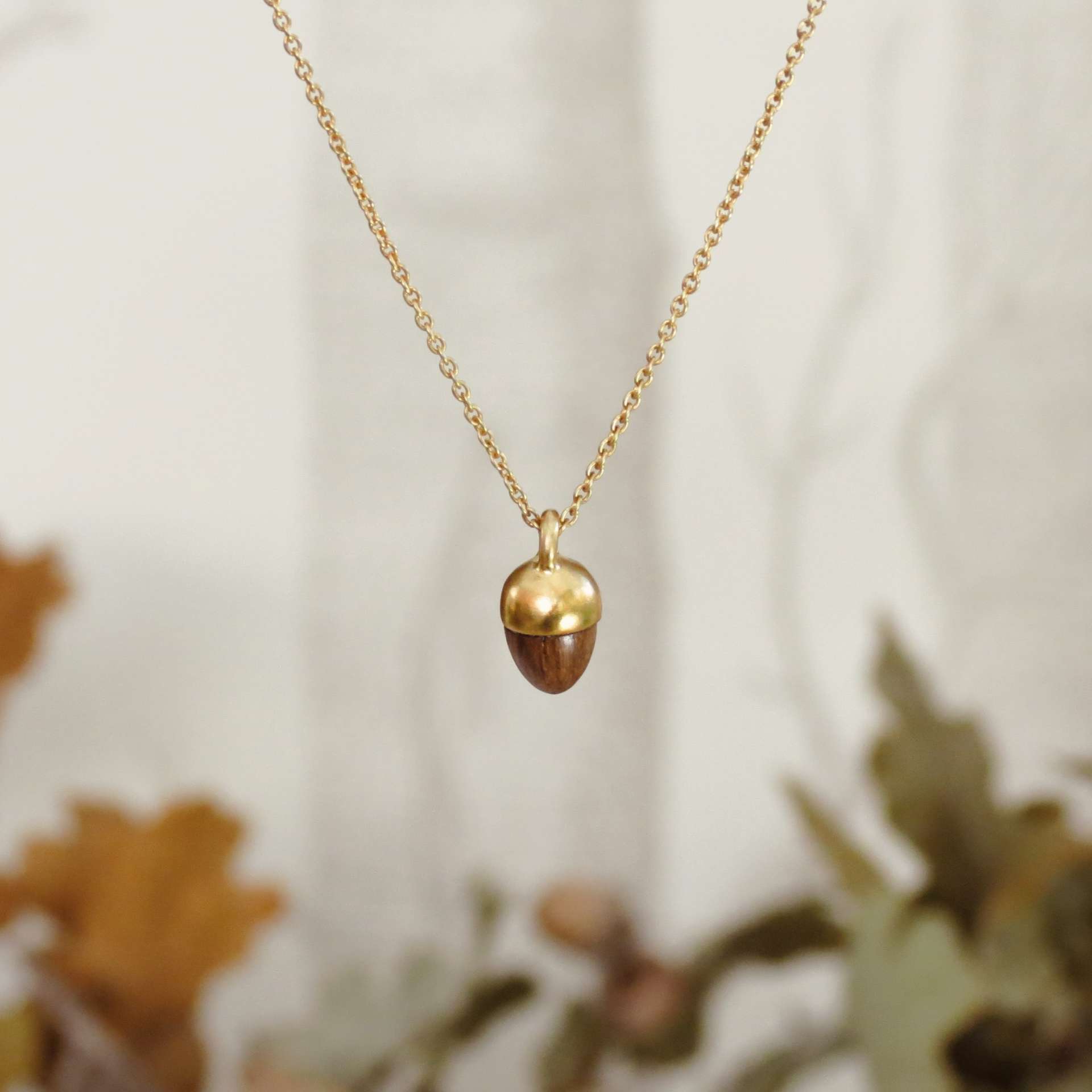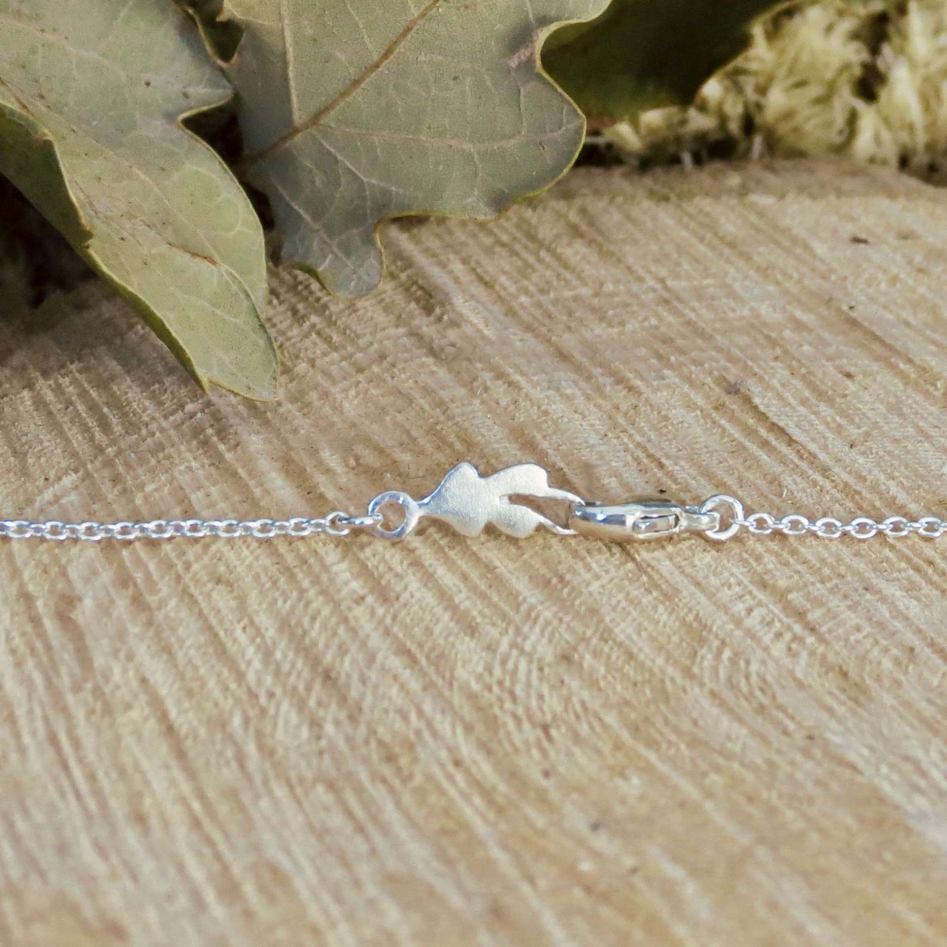 This pendant features our new smaller oak and silver acorn nestling into a silver or gold vermeil oak leaf