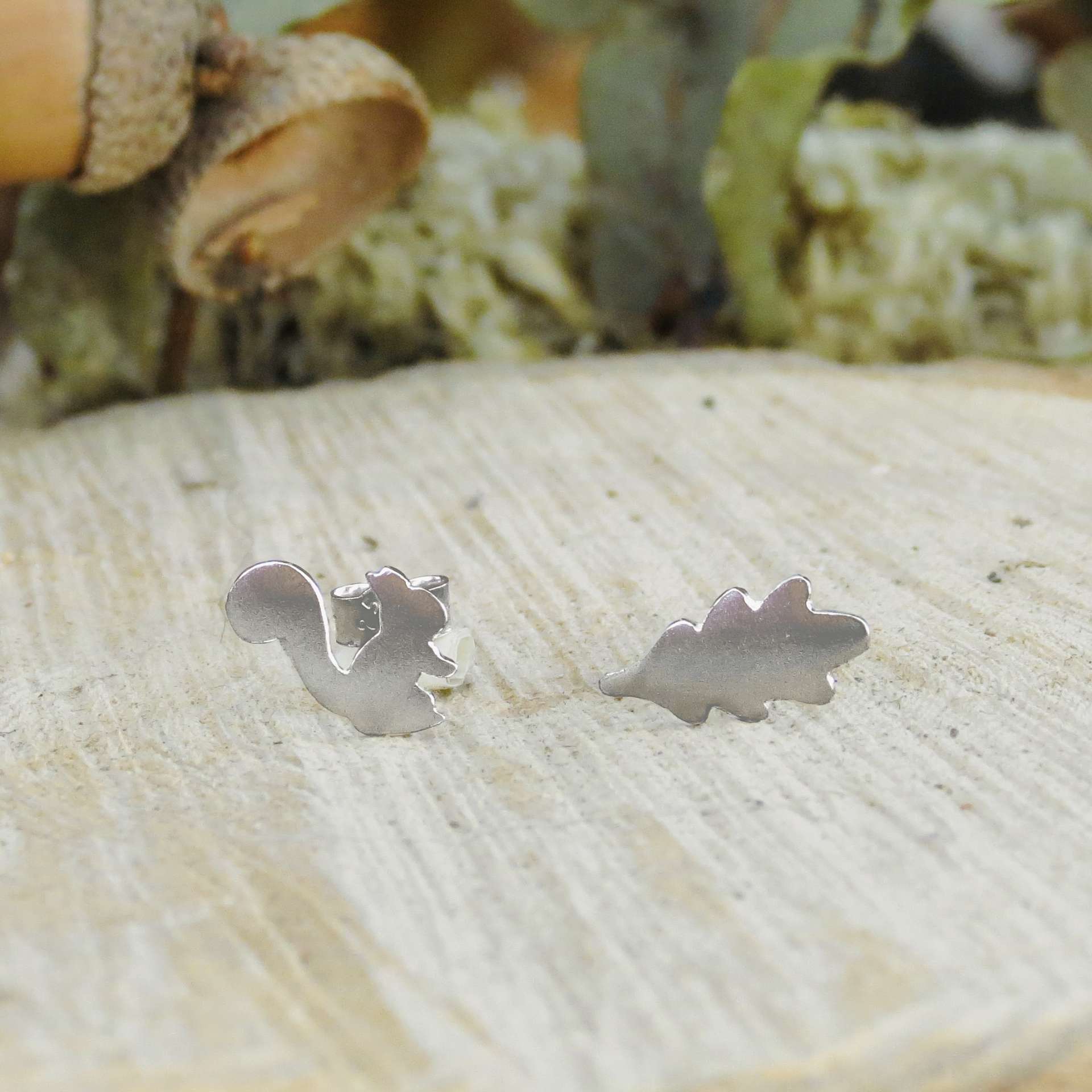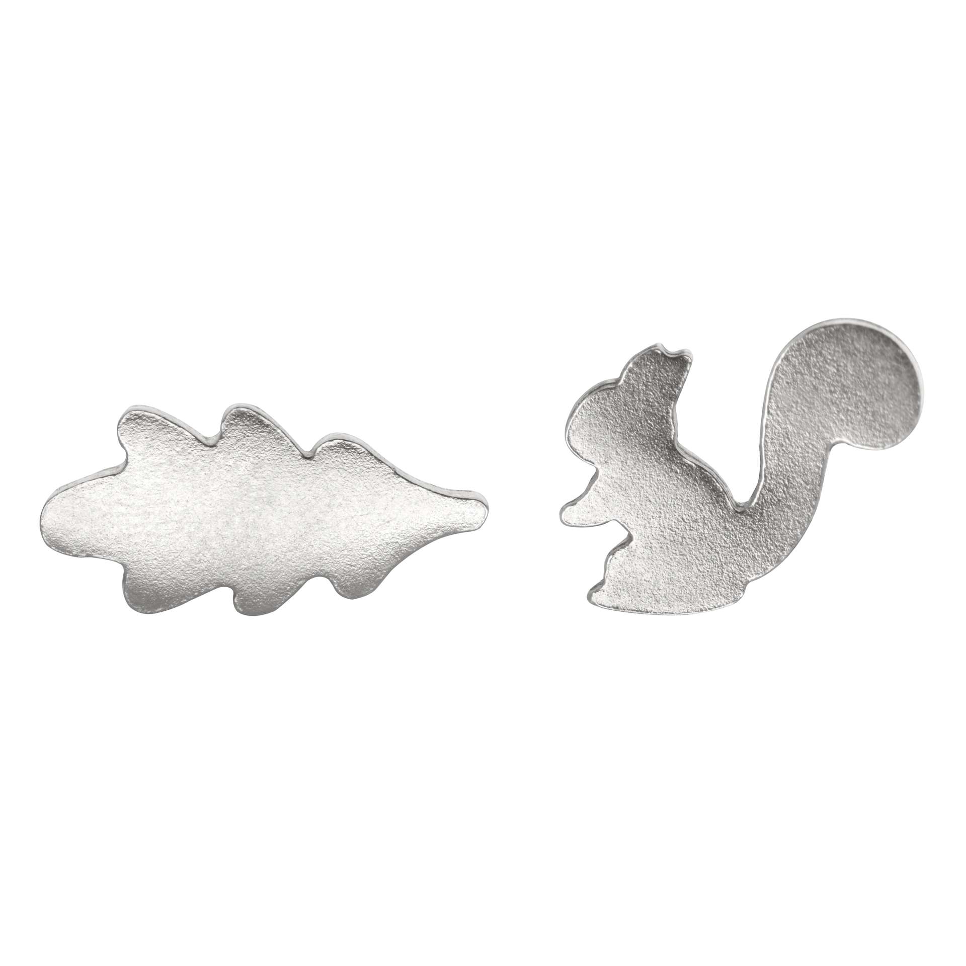 Sterling silver or gold vermeil squirrel and oak leaf mis-matched ear studs